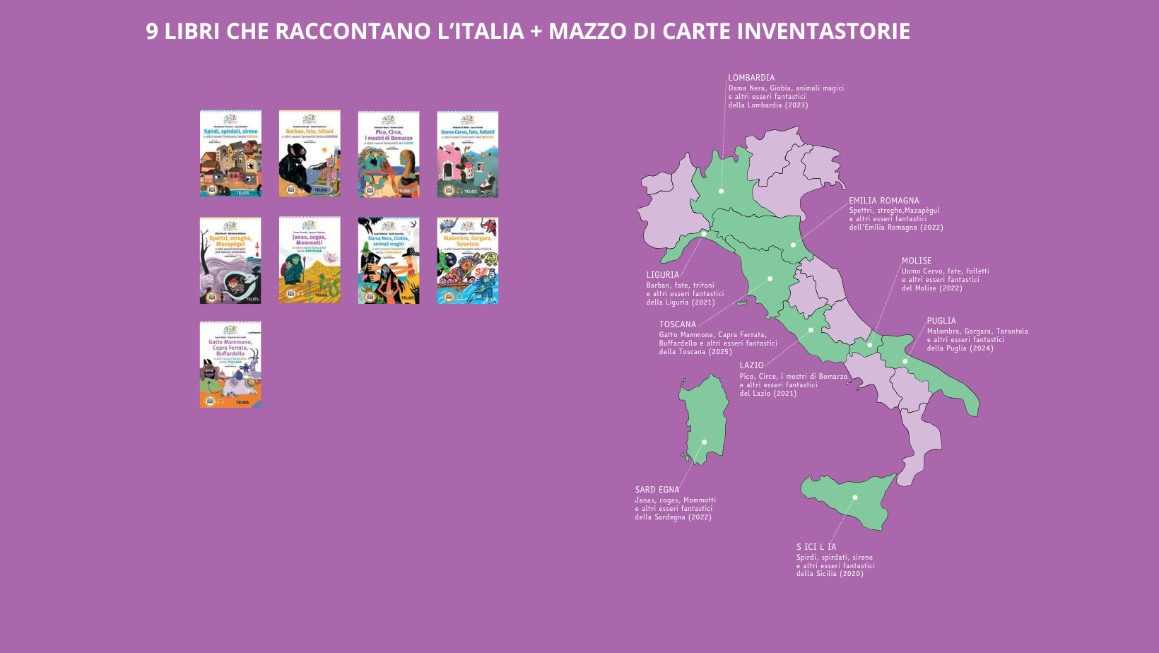 Si tratta di una collana ideata e curata da Teresa Porcella che racconta, regione per regione d’Italia, storie di esseri e creature fantastiche e mostruose, luoghi magici, storie avvincenti che ci fanno immergere in una tradizione antica che affonda le sue radici nella narrazione orale.